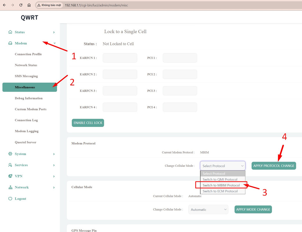 Trường hợp đã kết nối được wifi nhưng không vào được mạng, vào lần lượt các mục đánh số thứ tự để thay đổi cài đặt Modem Protocol thành MBIM