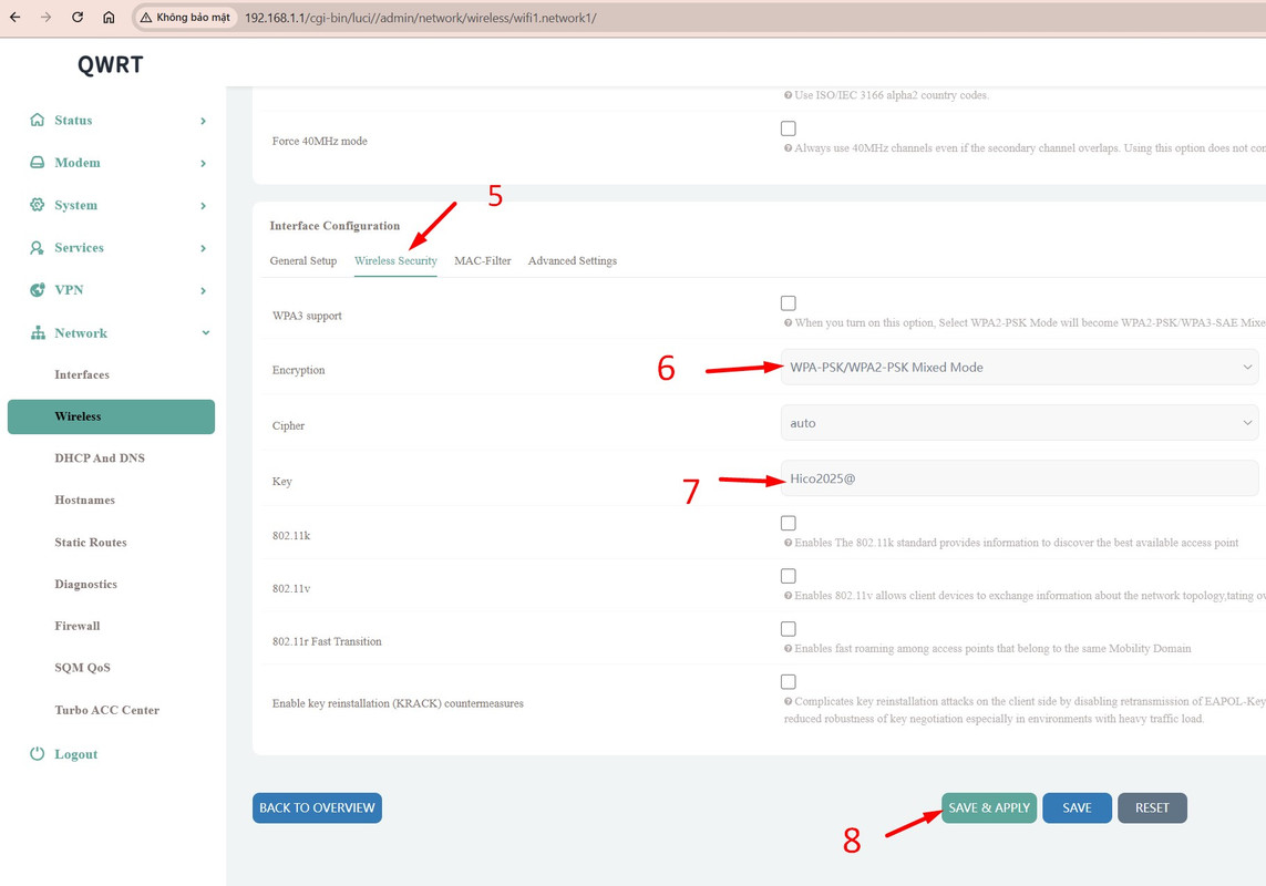 - Bấm vào Wireless Sercurity (5), Encryption chọn WPA-PSK/WPA2-PSK Mixed Mode (6). Điền mật khẩu wifi mới vào ô KEY (7)