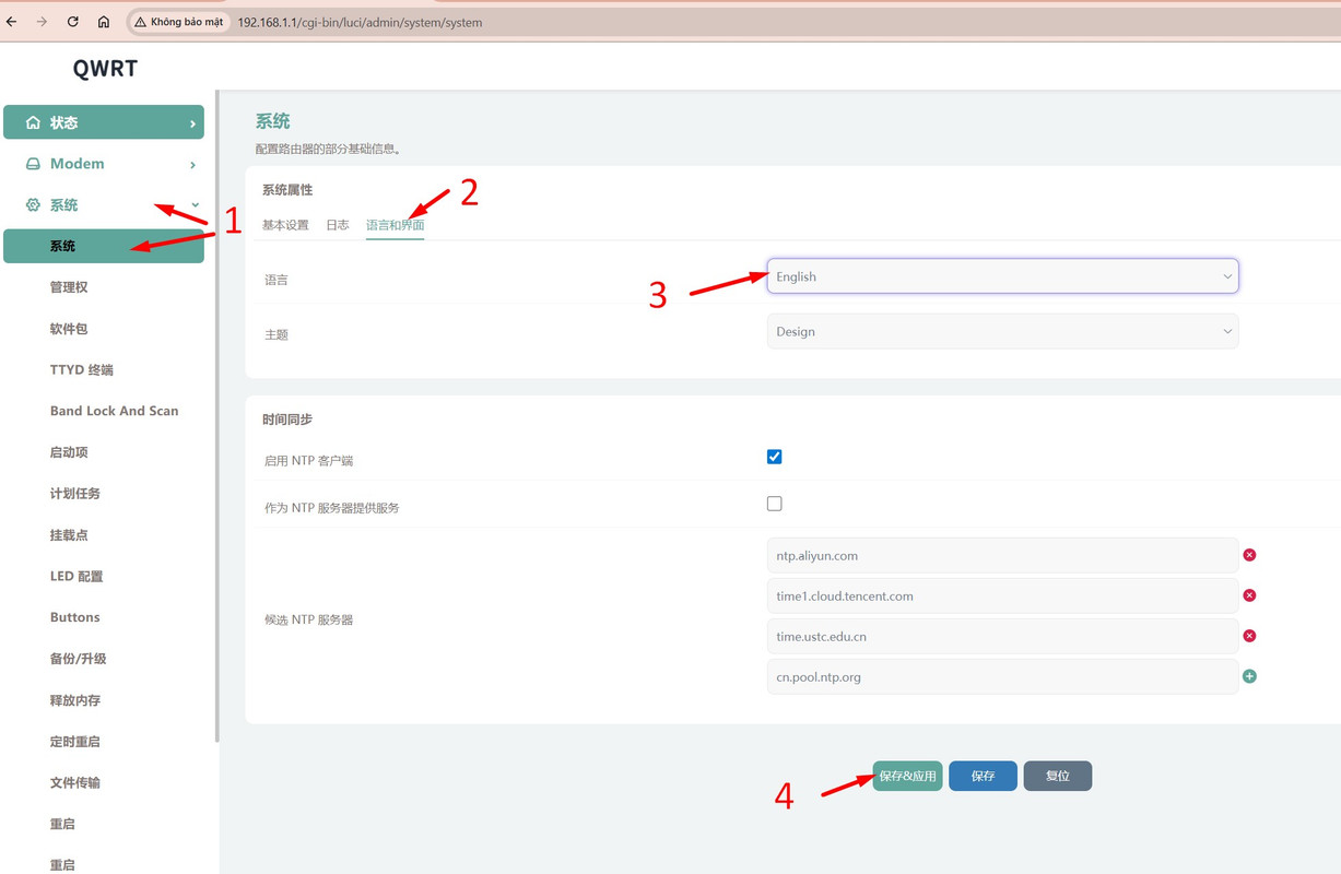 Nếu ngôn ngữ ban đầu là tiếng Trung Quốc thì bạn vẫn bấm theo như hình đi minh họa, sau đấy vào đổi ngôn ngữ theo ảnh bên dưới. Thao tác lần lượt theo số thứ tự trong ảnh