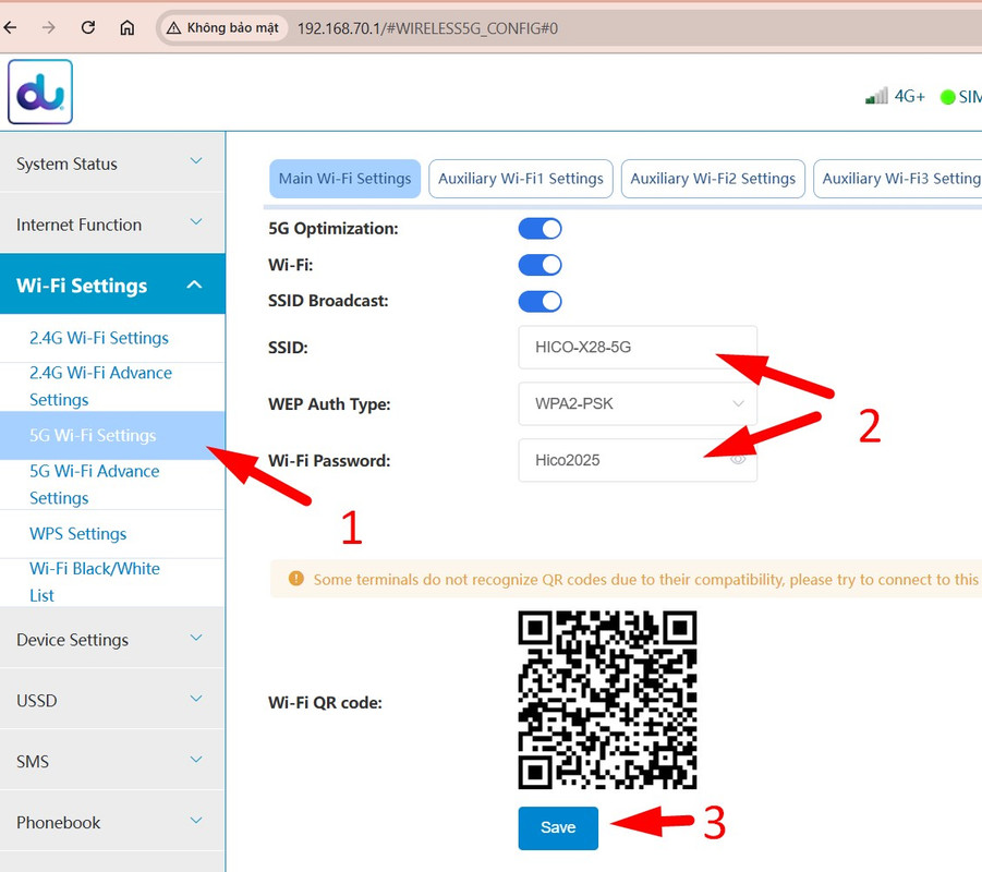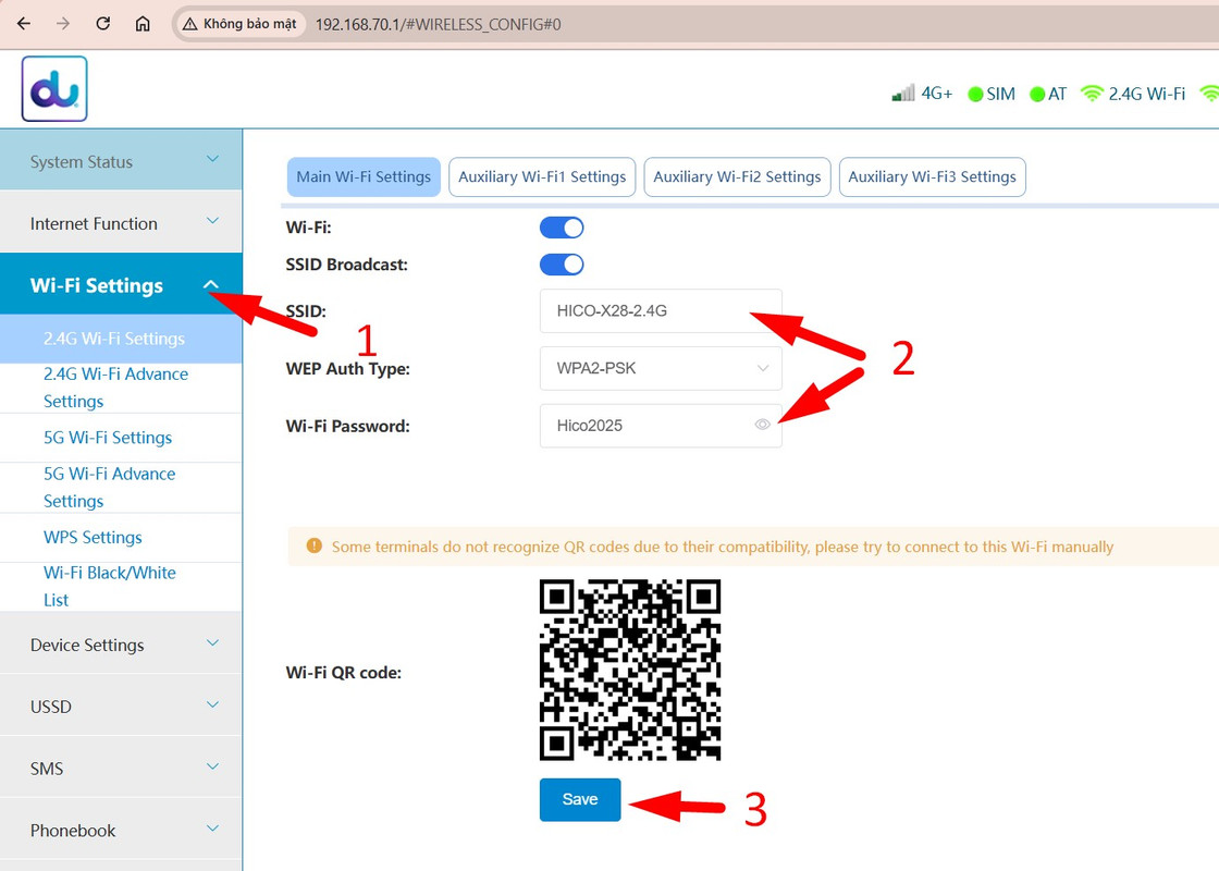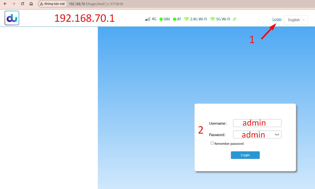 Kết nối lại với tên wifi và mật khẩu mới đã thay đổi, tiếp tục vào lại địa chỉ ip 192.168.70.1 và lặp lại các bước đăng nhập bên trên